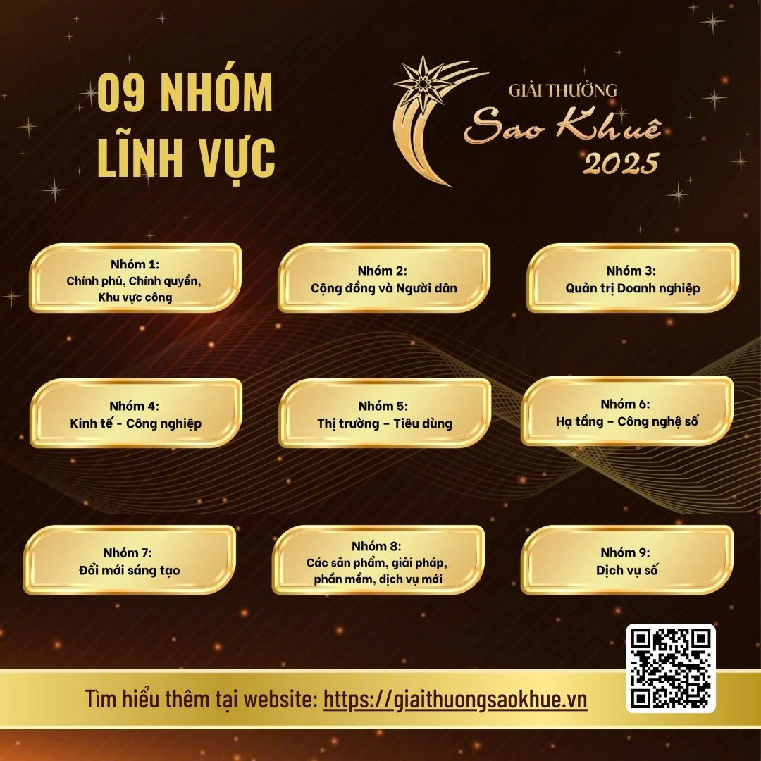 Giải thưởng Sao Khuê 2025 xét trao 9 nhóm (với 62 lĩnh vực) đã góp phần tạo nên bản đồ công nghệ số Việt Nam. Chi tiết các lĩnh vực xem tại: https://giaithuongsaokhue.vn/linh-vuc-binh-chon-2/
